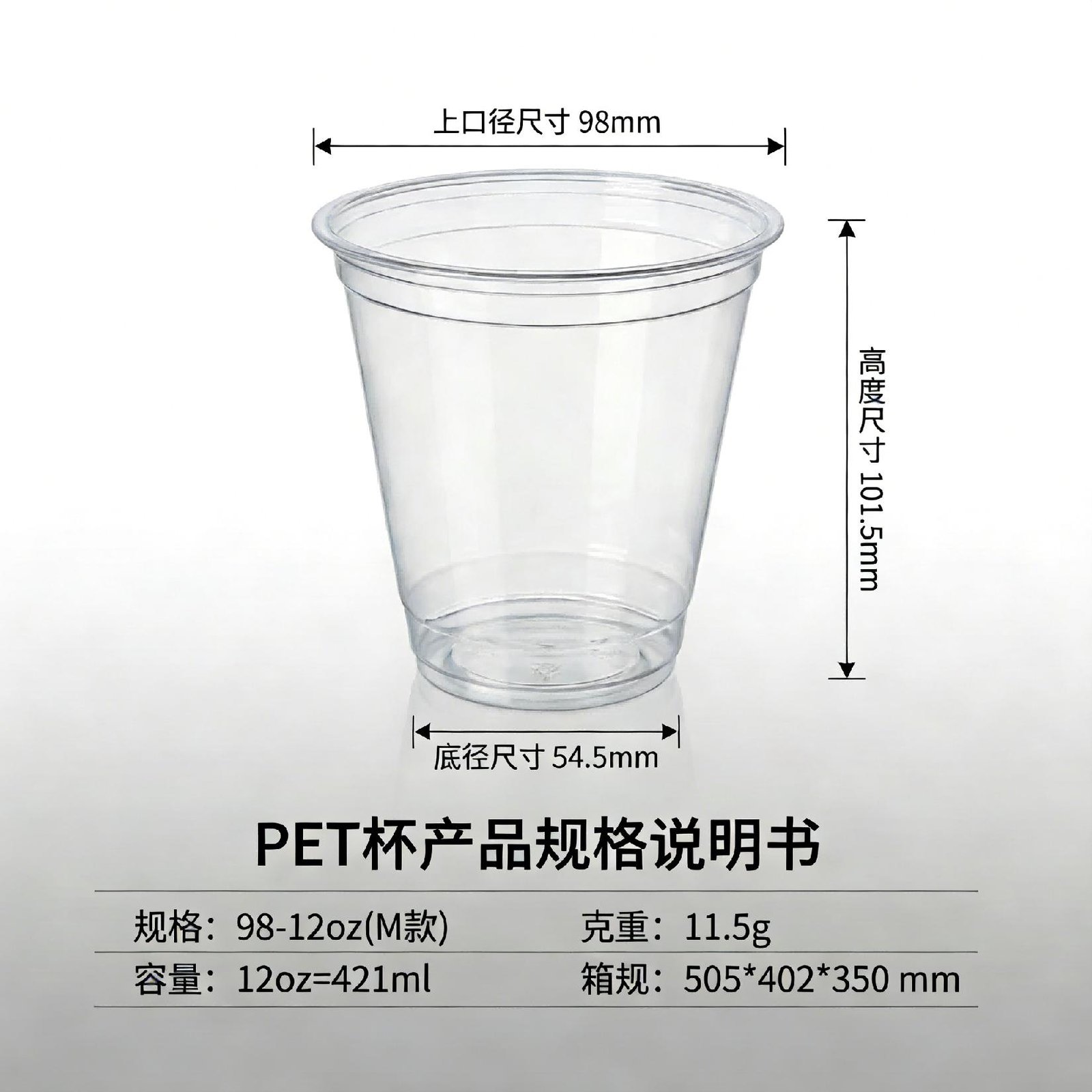 Product Overview Offer your customers a little extra with our 12oz (421ml) 98mm Caliber Tall Profile PET Cup (M-Style). This uniquely designed cup pushes the 12oz boundary to 421ml while utilizing a taller, sleeker silhouette. It’s the perfect choice for establishments looking to offer a “large” feel in a small cup size.